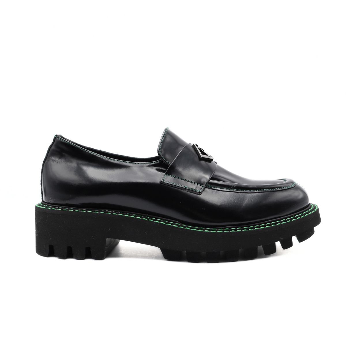 Mocassino da donna di POESIE VENEZIANE realizzato in pelle nera con logo verniciato e cuciture verdi sul guardolo. Interno e sottopiede, non estraibile, in pelle. Suola in gomma (3,5cm).