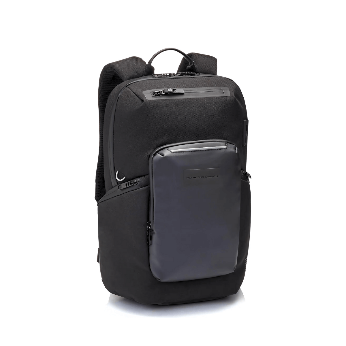 Zaino da uomo Porsche Design. Esclusivo mix di materiali con poliestere riciclato. Scomparto per notebook da 13'' o tablet e aggancio per trolley .Le cinghie imbottite, lo schienale in neoprene imbottito con aggancio per trolley, la tasca principale con cerniera a doppio cursore, connettore USB e scomparti per notebook e tablet, le numerose tasche funzionali con organizer e la copertura antipioggia nascosta nella base rendono questo zaino il compagno perfetto 24 ore su 24.