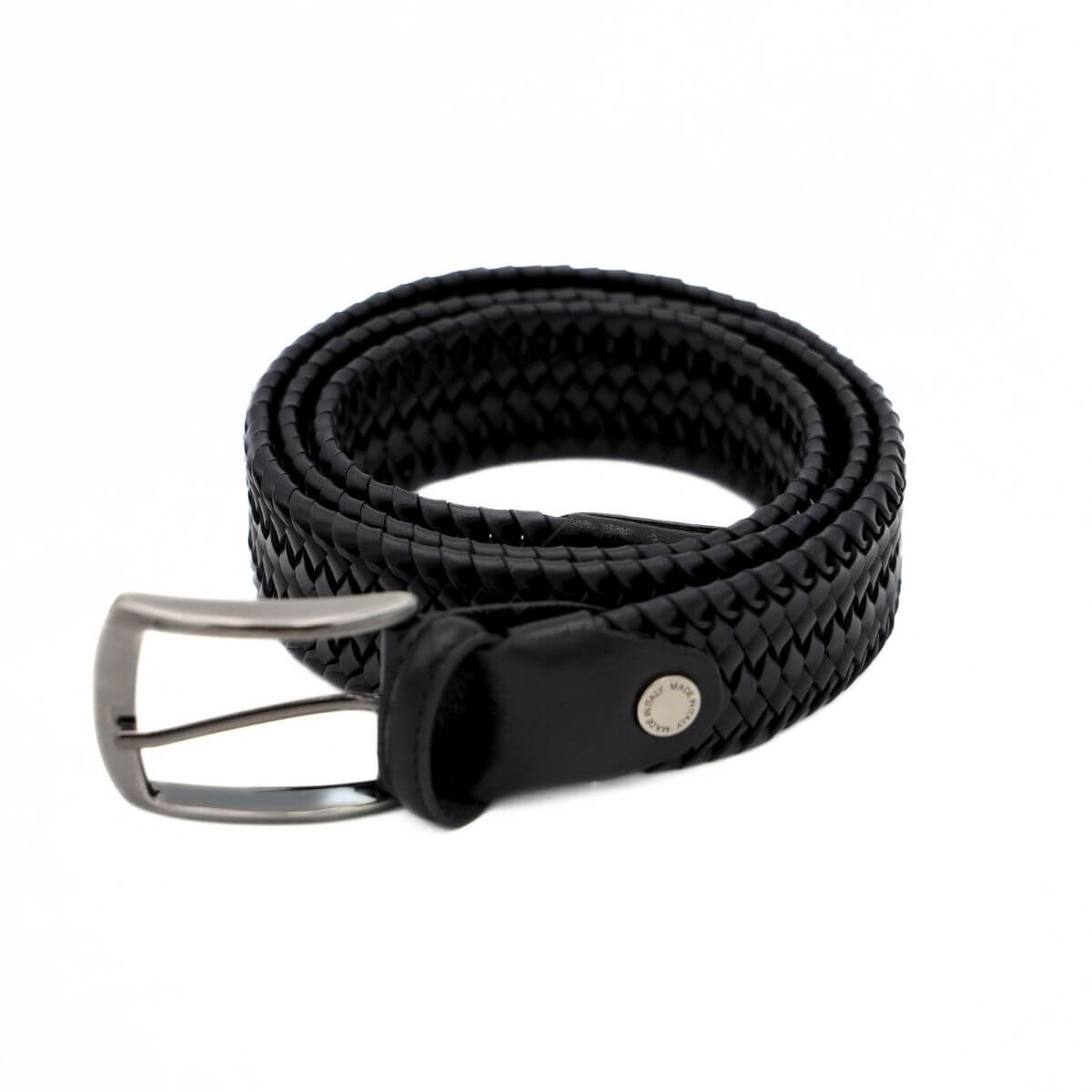 Cintura da uomo di PRATENICE realizzata in morbida pelle nera intrecciata a spina di pesce.