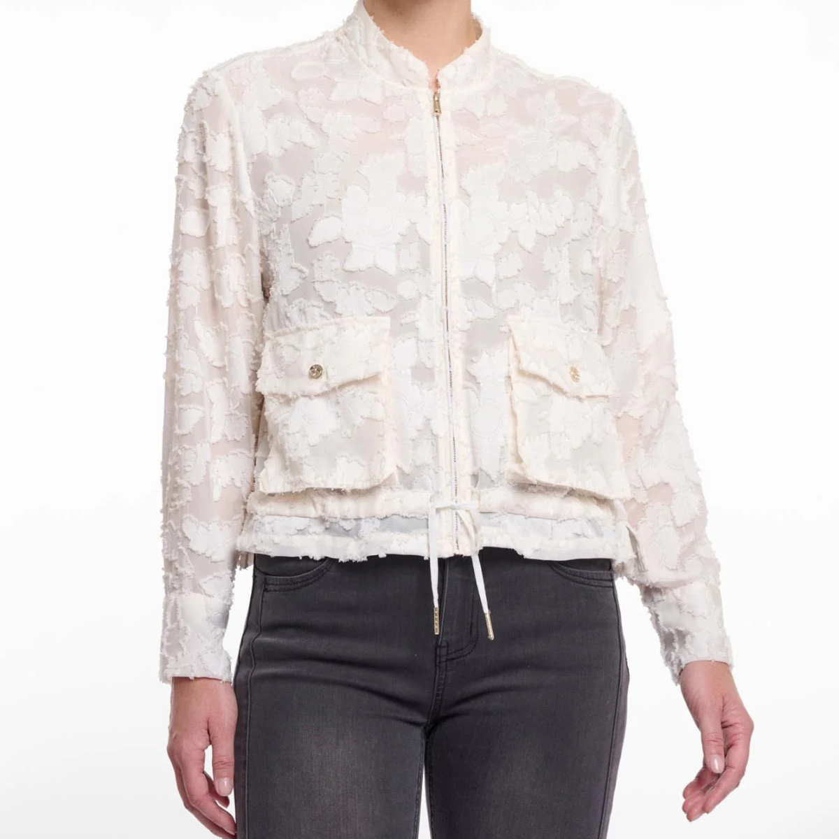 Giacca di RINO&PELLE realizzata in leggero tessuto di pizzo. Dotata di pratiche tasche con patta, un cordoncino regolabile in vita e cerniera anteriore. Vestibilità regolare.