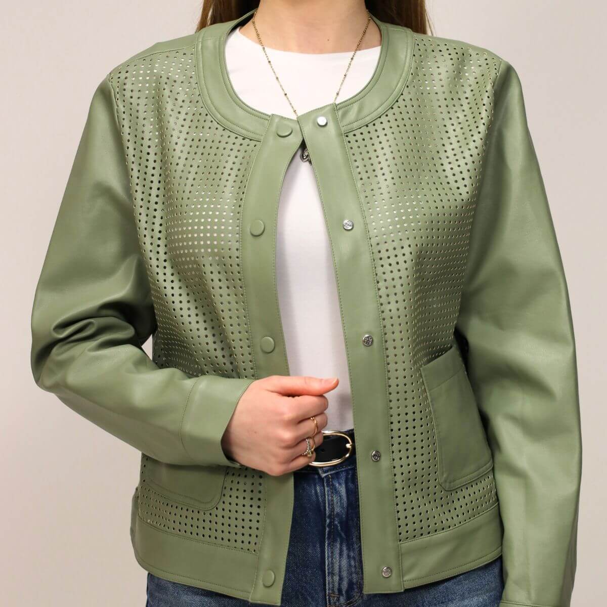 Giacca forata da donna di RINO&PELLE, realizzata similpelle verde con tasche frontali e chiusura con bottoni.
