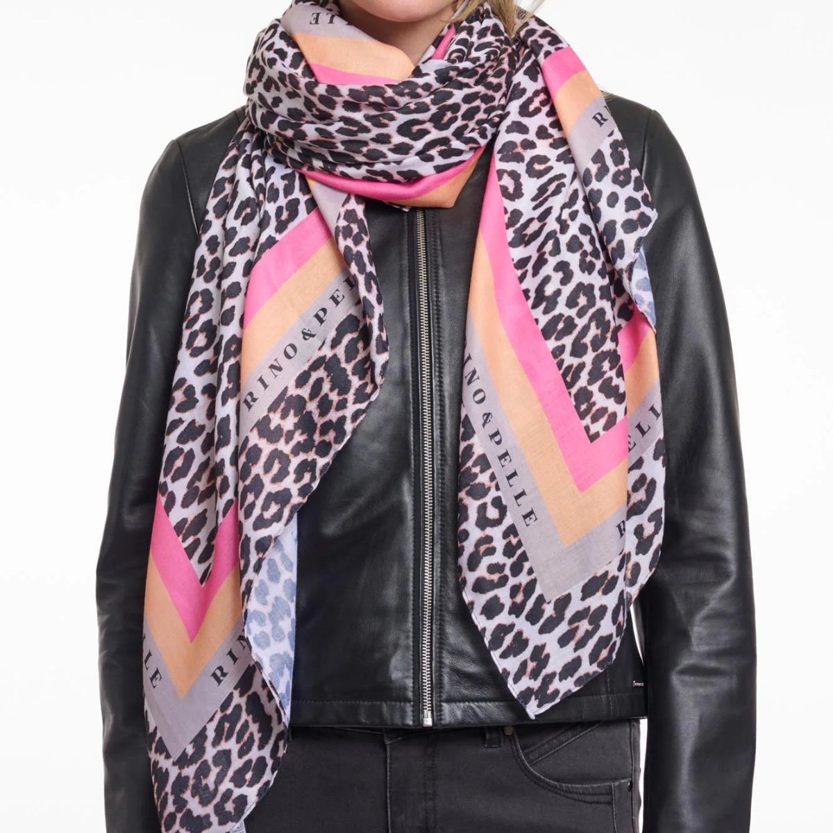 Sciarpa da donna di RINO&PELLE, realizzata in tessuto leopardato con bande multicolore.
