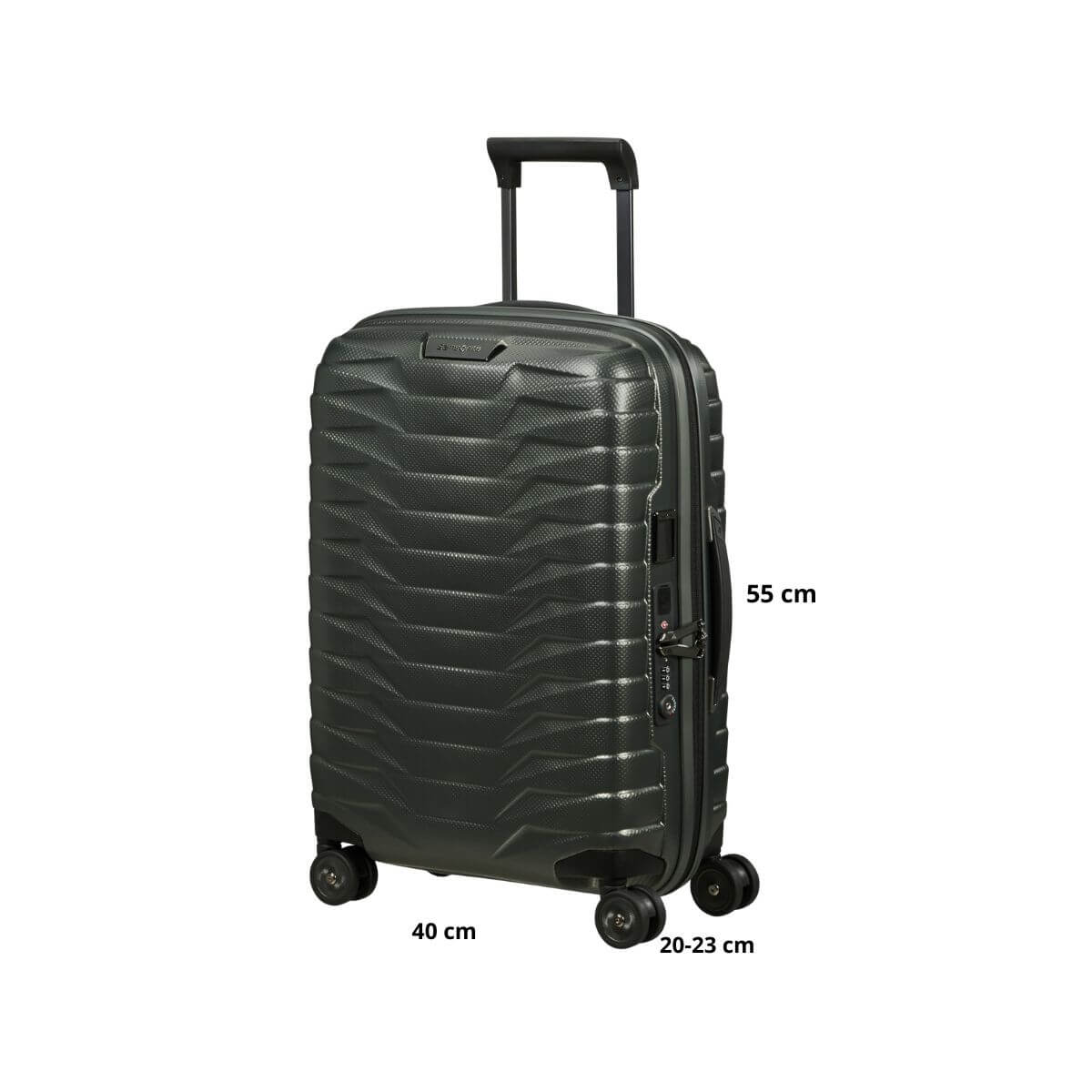 Bagaglio a mano rigido, della linea PROXIS di SAMSONITE dal design unico e avanzate tecnologie color verde opaco. Realizzato in materiale Roxkin™ polipropilene, materiale innovativo altamente flessibile in caso di impatto e molto resistente. Ritorna in forma facilmente. Vano interno organizzato con divisorio e cinghie elastiche. Chiusura con combinazione e sistema TSA e porta USB integrata. Quattro ruote bidirezionali. Carrello bitubo. Valigia espandibile.