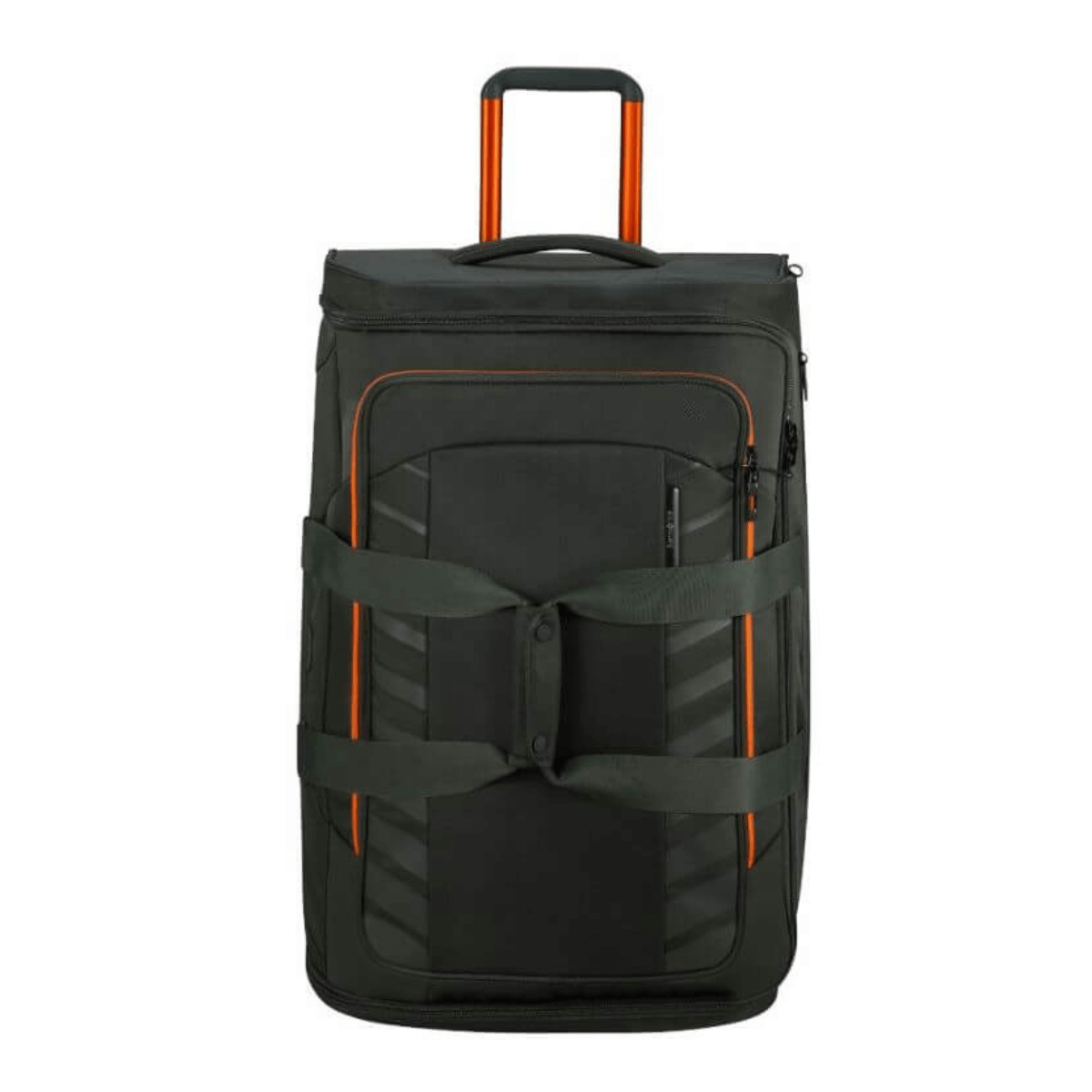 Borsone con ruote della linea RESPARK di SAMSONITE realizzato in tessuto PET 100% riciclato post-consumo con profili arancioni. Unico vano porta abiti con cinghie. Tasche accessorie estrene. Chiusura con cerniera, sistema di combinazione TSA e gancio in alluminio.