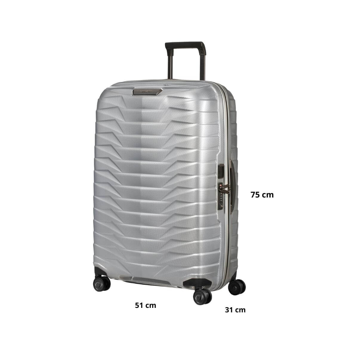 Trolley medio-grande rigido, della linea PROXIS di SAMSONITE dal design unico e avanzate tecnologie color argento. Realizzato in materiale Roxkin™ polipropilene, materiale innovativo altamente flessibile in caso di impatto e molto resistente. Ritorna in forma facilmente. Vano interno organizzato con divisorio e cinghie elastiche. Chiusura con combinazione e sistema TSA. Quattro ruote bidirezionali. Carrello bitubo.