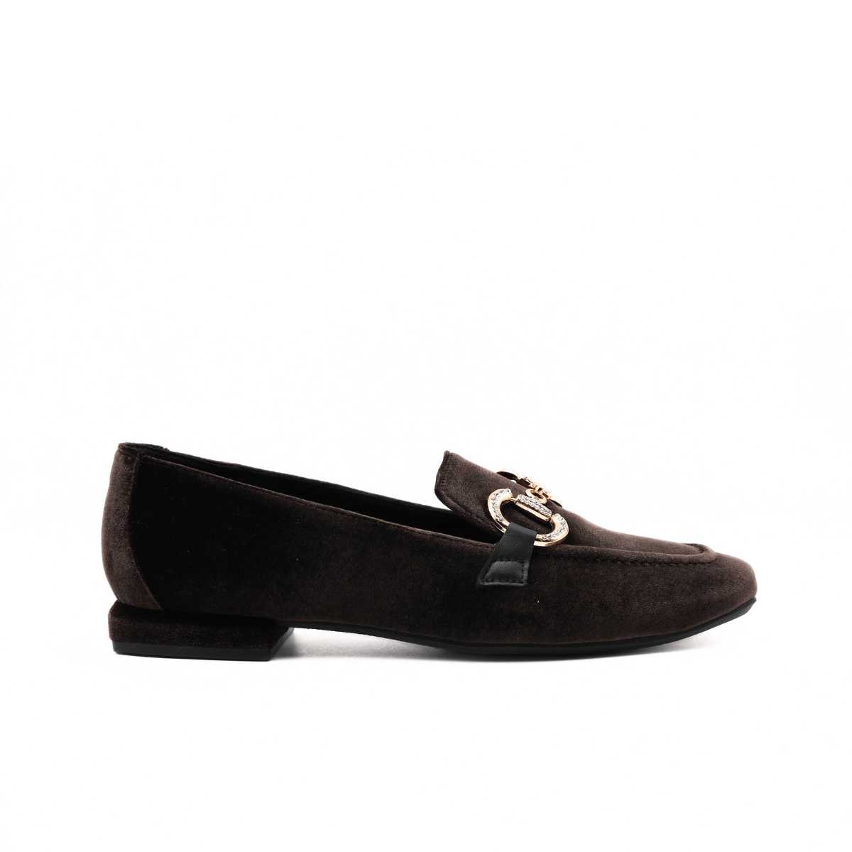 Mocassino da donna di SAN PIERO, realizzato in velluto testa di moro con morsetto con brillantini. Interno e sottopiede, non estraibile, foderati in pelle. Suola in gomma.