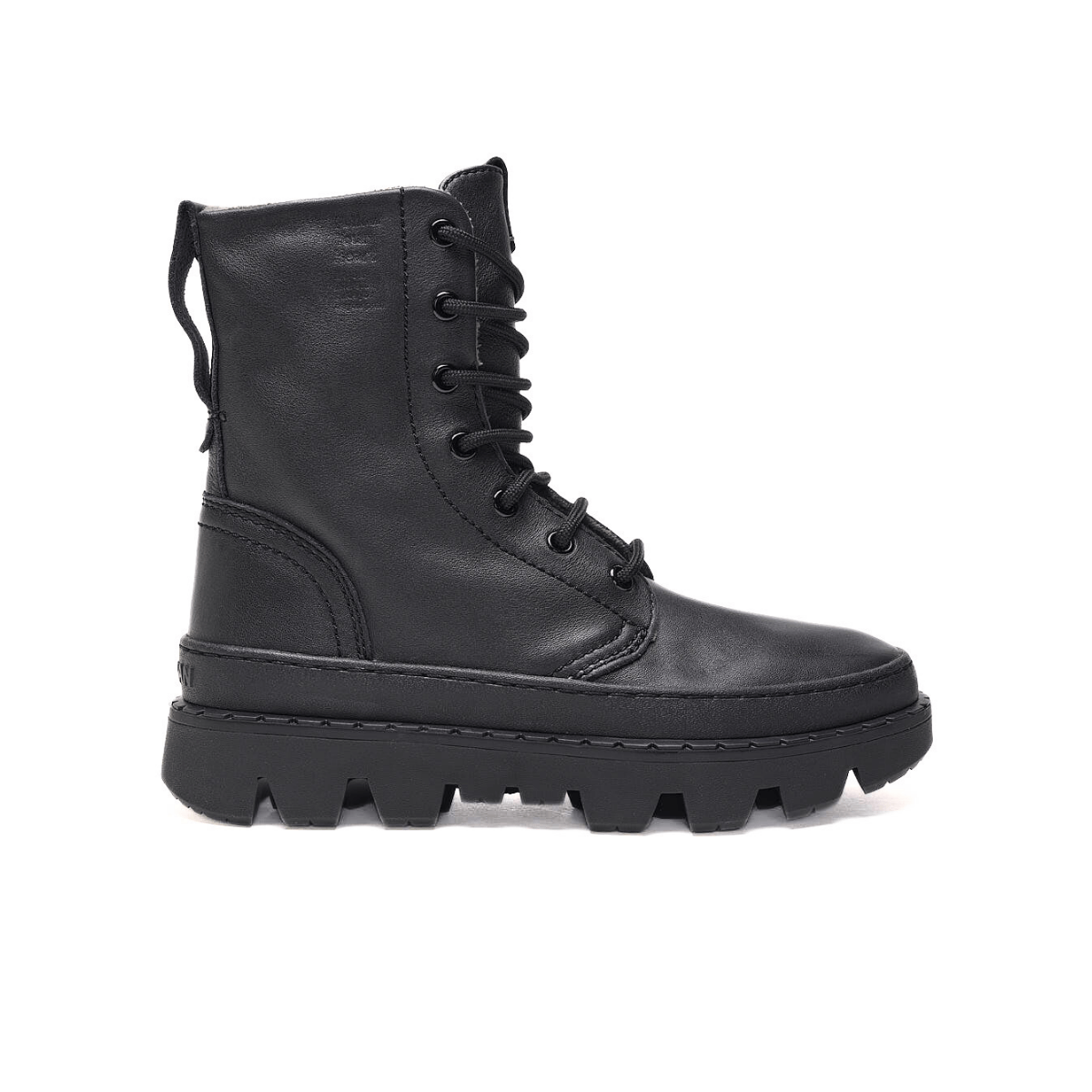 Anfibio da donna di SATORISAN modello UNALOME, realizzata in pelle nera con zip unilaterale e chiusura con lacci. Interno in tessuto e sottopiede estraibile. Suola in gomma carrarmato.