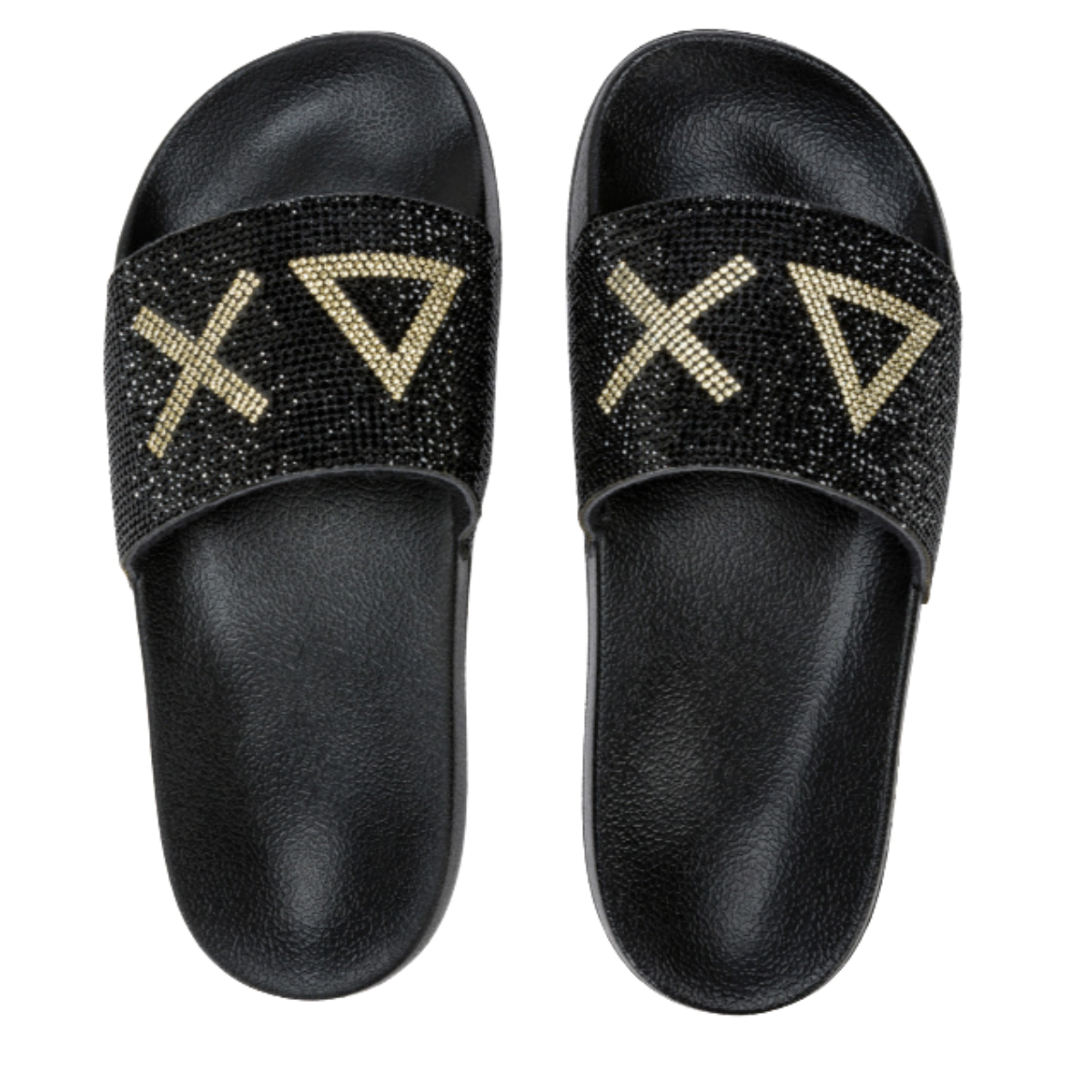 Ciabatta da donna fascia di SUN68, realizzata in materiale tecnico nero con strass e logo oro e suola in gomma.