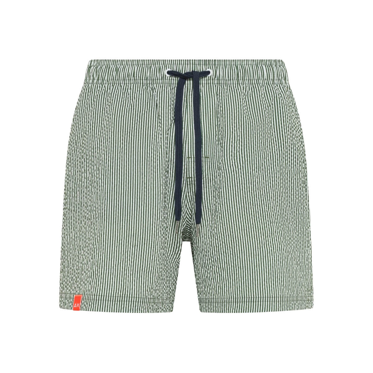 La fantasia a righe verdi dona profondità e personalità al look, mantenendo un’estetica pulita e facilmente abbinabile. I dettagli a contrasto e il logo iconico completano il design con un segno distintivo discreto, coerente con l’identità SUN68.