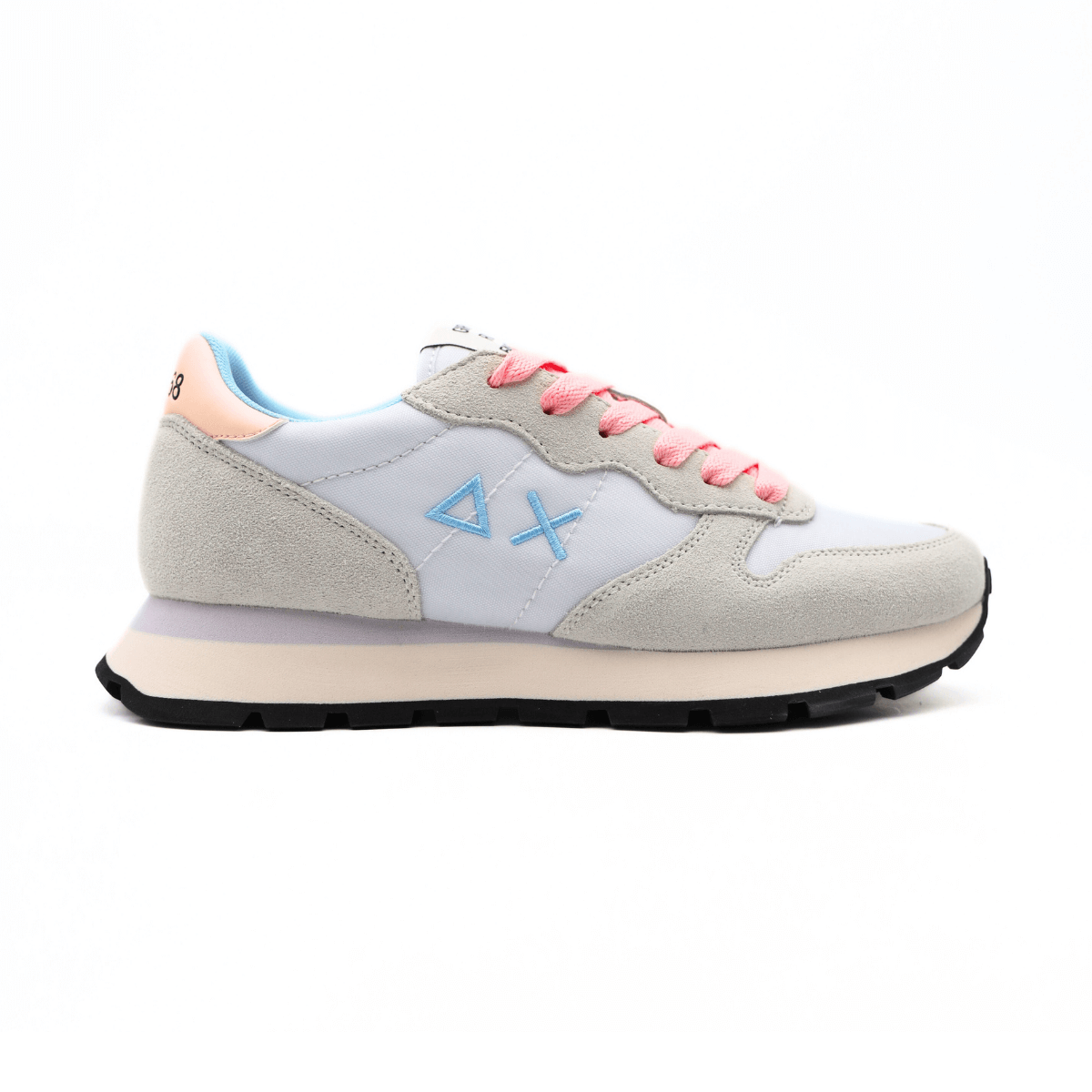 Sneaker, da donna, di SUN68. Tomaia realizzata in tessuto bianco con inserti in camoscio beige con tallone color panna. Interno e sottopiede, removibile, foderati in tessuto. Chiusura con lacci (lacci bianchi in dotazione). Suola running in gomma.
