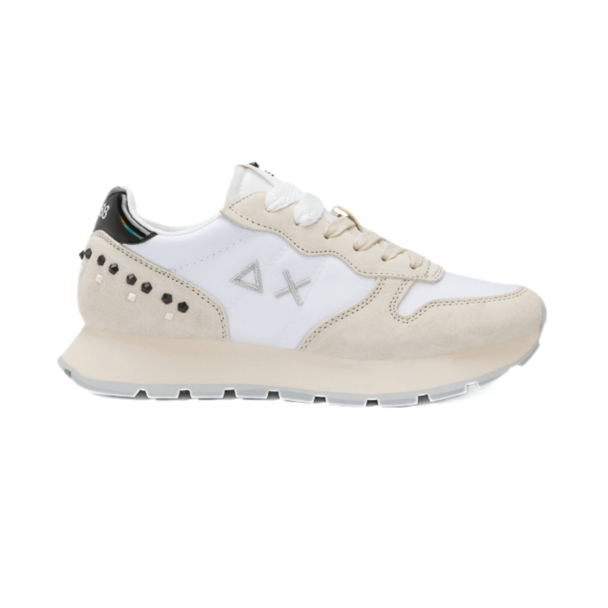 Sneaker, da donna, di SUN68. Tomaia realizzata in tessuto bianco con inserti in camoscio beige e tallone con borchie nere e bianchi. Interno e sottopiede, removibile, foderati in tessuto. Chiusura con lacci. Suola running in gomma.
