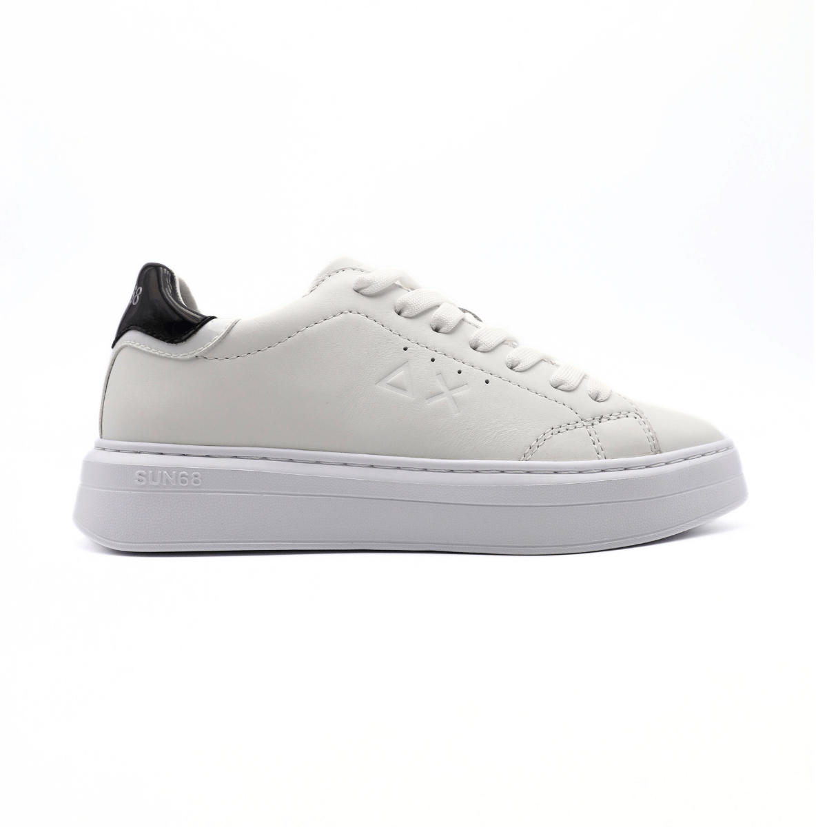 Sneaker, da donna, di SUN68. Tomaia realizzata in pelle bianca con logo unilaterale e tallone verniciato nero. Interno e sottopiede, removibile, foderati in pelle e tessuto. Chiusura con lacci (lacci neri con brillantini in dotazione). Suola in gomma.