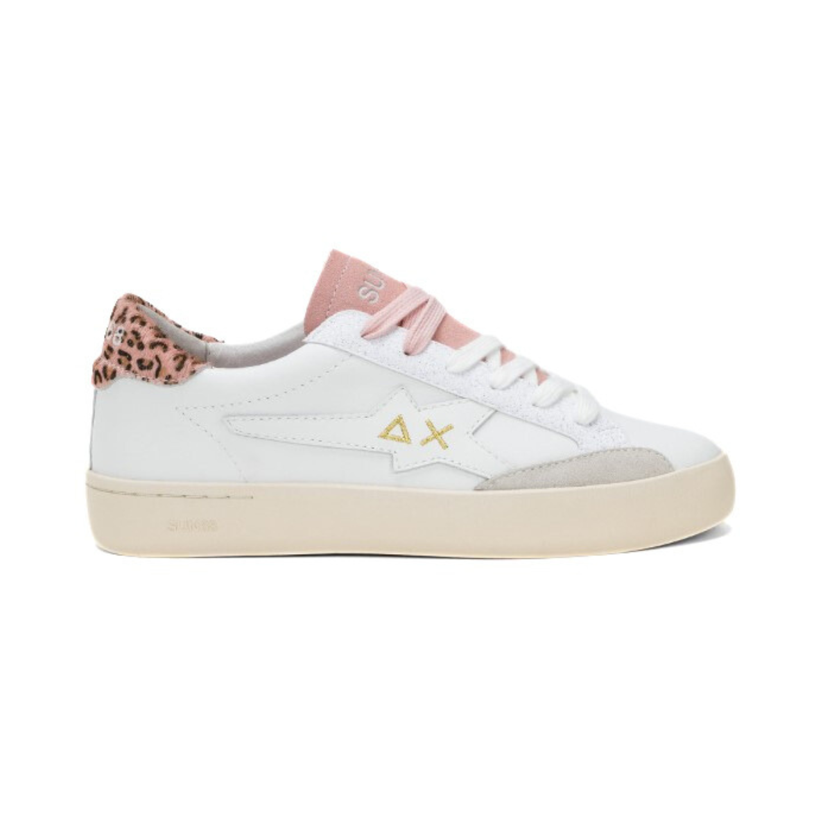 Esalta il tuo stile con le sneaker SUN68. Tomaia in pelle bianca con tallone maculato con base rosa. L'interno e il sottopiede rimovibile, foderati in pelle e non, garantiscono comfort e traspirabilità. Lacci di ricambio inclusi. Suola in gomma.