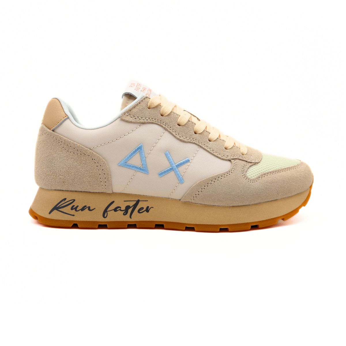 Sneaker da uomo, di SUN68. Tomaia realizzata in tessuto e camoscio beige. Interno e sottopiede, removibile, foderati in tessuto. Chiusura con lacci (lacci colorati in dotazione). Suola running in gomma vintage con scritta.