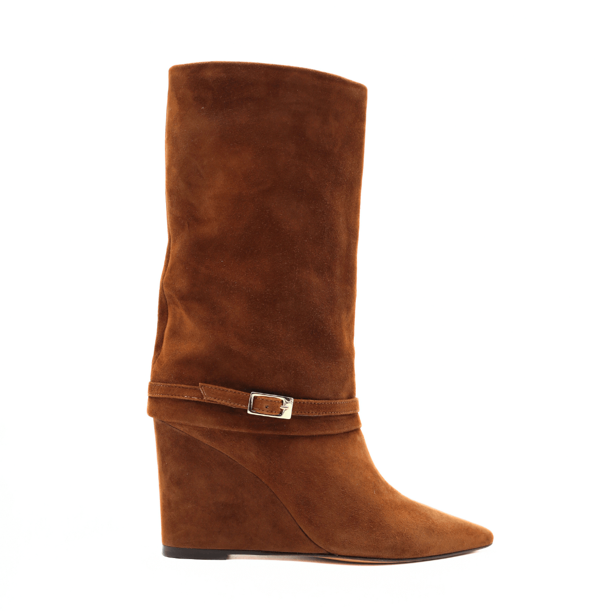 Stivale di THE SELLER realizzato in pelle scamosciata. La tomaia presenta un morbido risvolto tono su tono e un cinturino regolabile. Interno e sottopiede completamente rivestiti in pelle e suola in cuoio con parte in gomma.