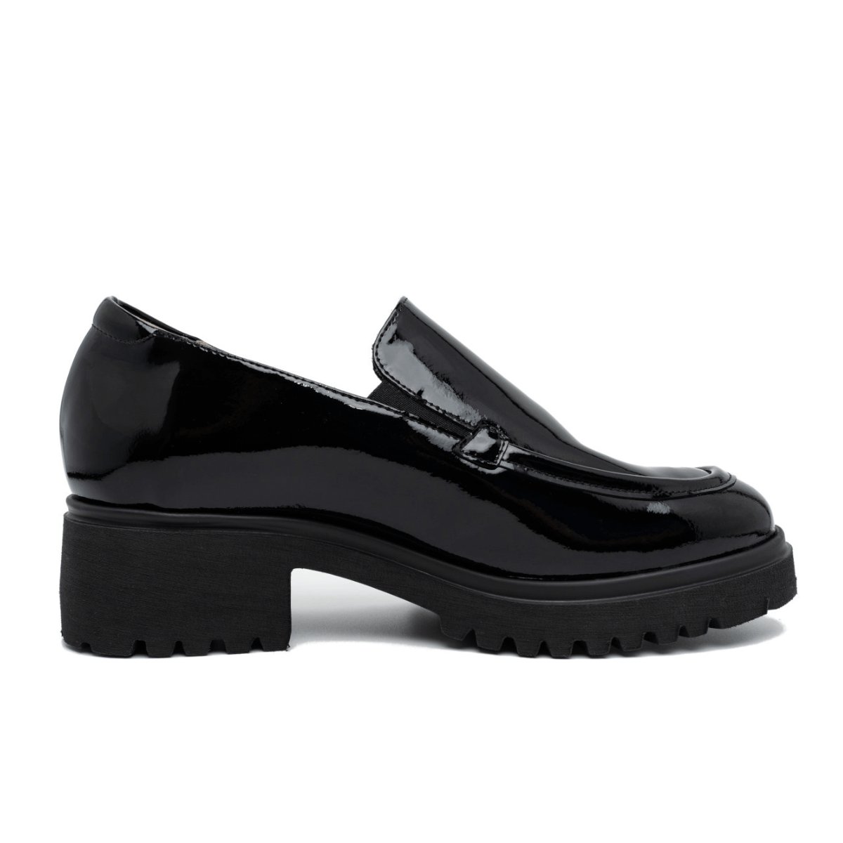 Mocassino da donna di FRATELLI TOMASI in pelle verniciata nera. Interno realizzato in pelle con morbido sottopiede estraibile. Doppio inserto elasticizzato. Suola in gomma (altezza tacco: 4cm).