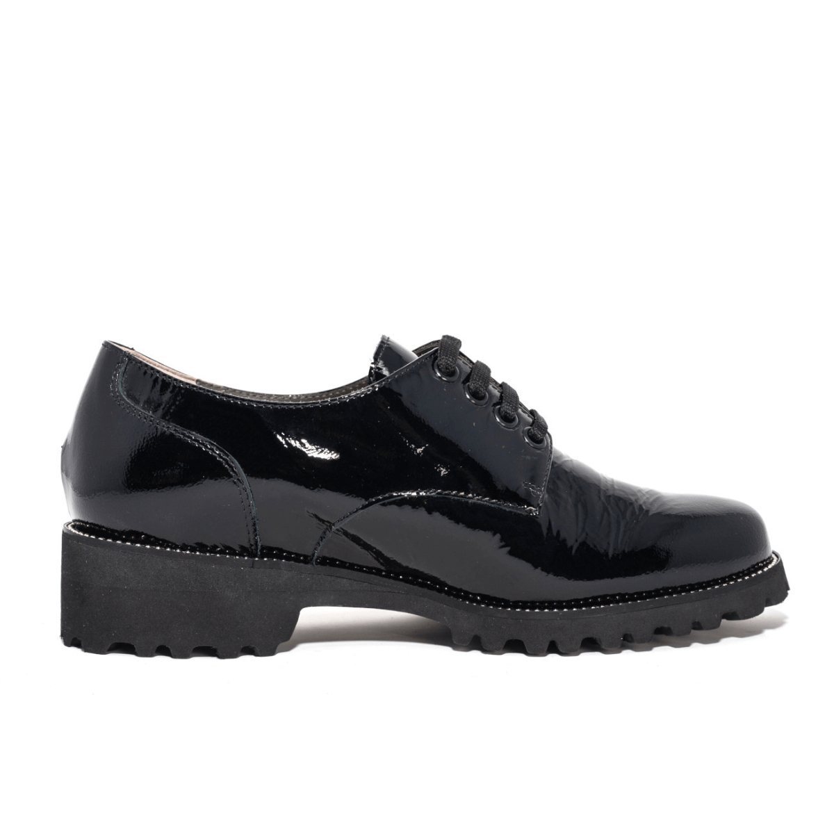 Stringata da donna di FRATELLI TOMASI in pelle verniciata nera. Interno realizzato in pelle con morbido sottopiede non estraibile. Chiusura con lacci. Suola in gomma (altezza tacco: 4cm).