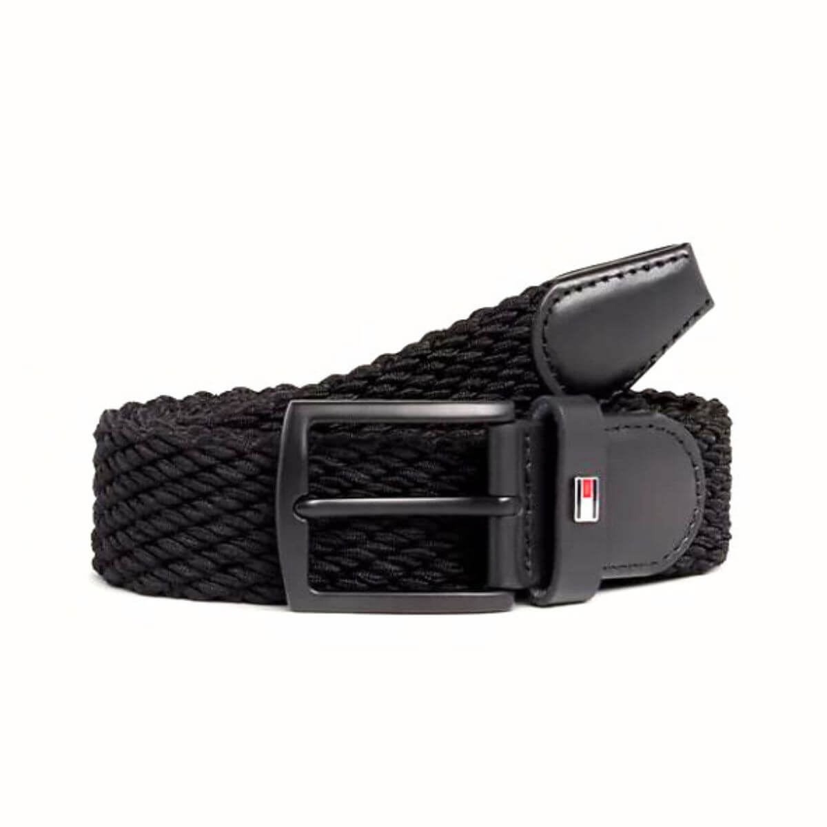 L'elegante cintura in tessuto elastico nero è completata dalla fibbia quadrata con finitura tono su tono, per un look d'ispirazione contemporanea.