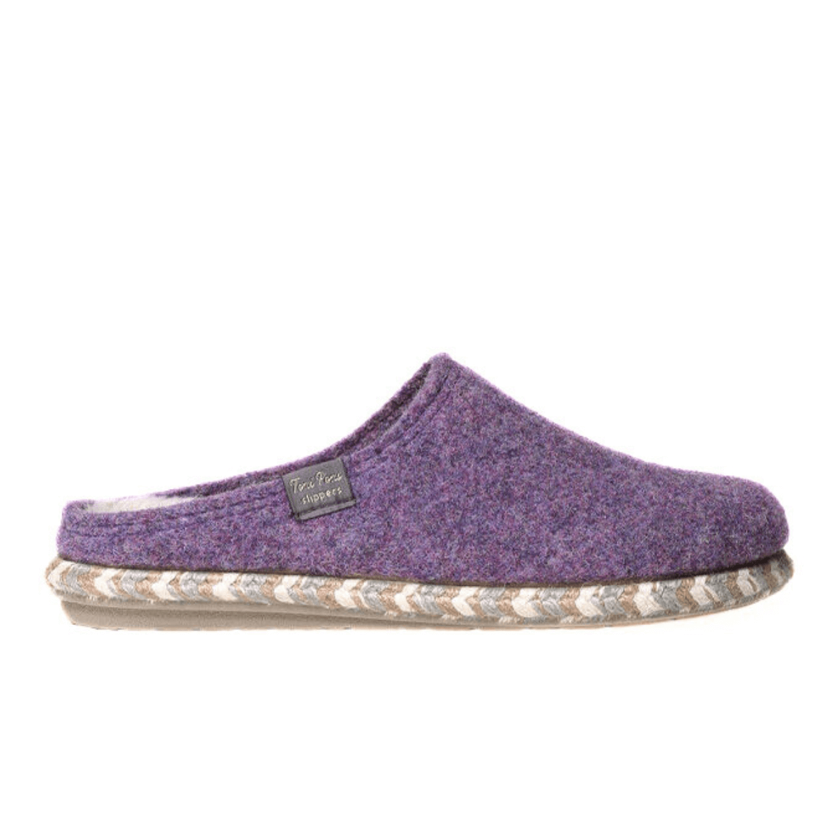 Ciabatta da donna di TONI PONS. Tomaia realizzata in feltro di lana color lilla. Plantare estraibile rivestito rivestita in morbido pelo che scalda il piede. Suola lavorata a mano in gomma.