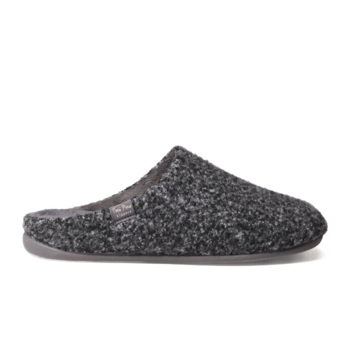 Ciabatta da uomo di TONI PONS. Tomaia realizzata in tessuto screziato grigio e nero. Plantare estraibile rivestito rivestita in morbido pelo. Suola lavorata a mano in gomma.