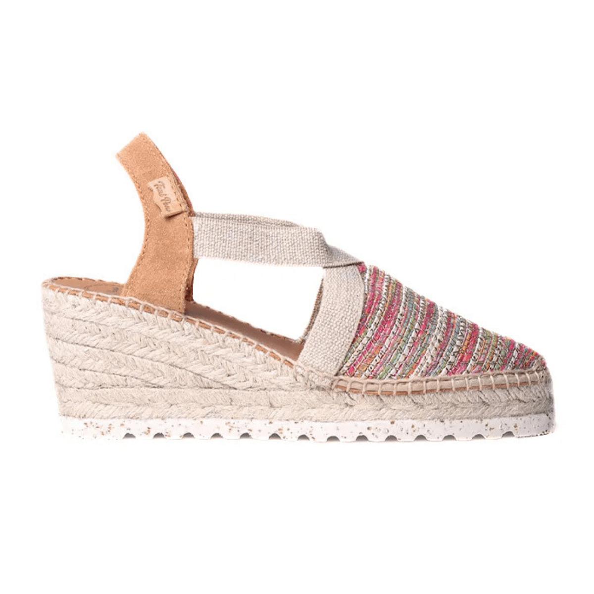 Zeppa in corda di TONI PONS, realizzato con puntale in tessuto raffia con ricamo multicolore, con elastici alla caviglia. Sottopiede in pelle e suola in gomma, con zeppa in corda (7cm).