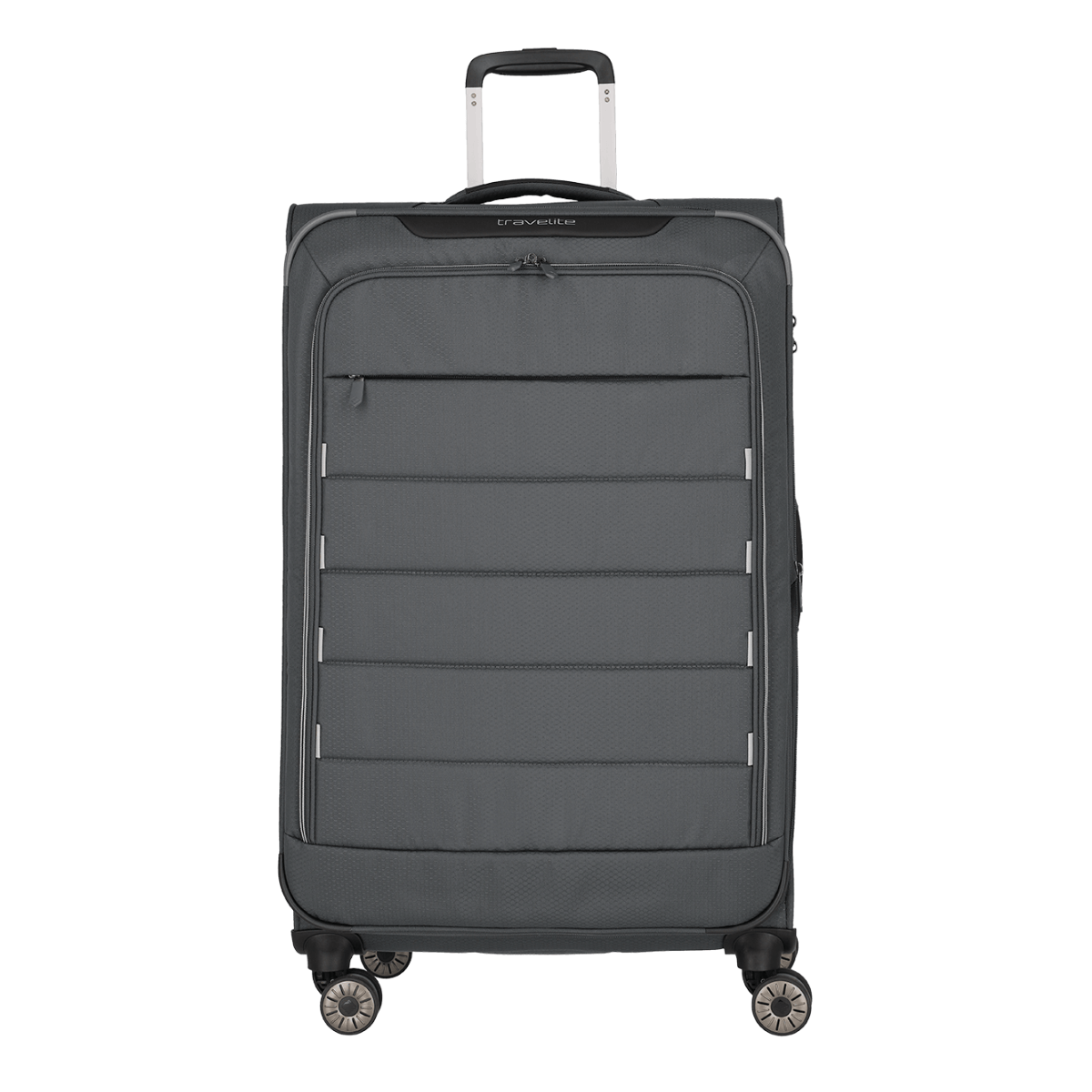 Trolley grande morbido di TRAVELITE, della linea SKAII, realizzato in tessuto antracite. Organizzazione interna funzionale: scomparto per la camicia, con tasca in rete con cerniera annessa, piccola tasca laterale e cinghie di fissaggio. Due pratiche tasche anteriori di diverse dimensioni. Maniglia inferiore per una migliore maneggevolezza durante il sollevamento. Valigia espandibile. Ruote doppie da 5,5 cm. Chiusura con combinazione TSA. Particolarmente leggero, con soli 2,9 kg.