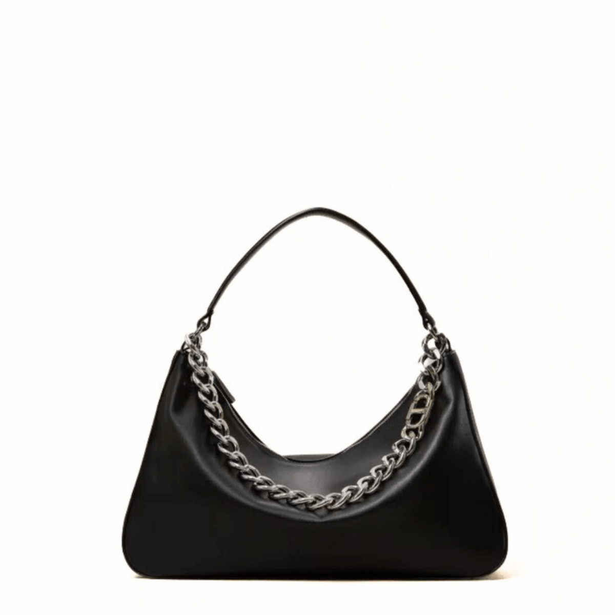 Borsa hobo 'Liliane' di TWINSET made in Italy, realizzata inpelle di vitello lisciopieno fiore con trattamento anti goccia e antigraffio. Il corpo è realizzato a colonna, con logo impresso a caldo, e foderato con un twill in misto cotone. Ha due manici staccabili, da indossare simultaneamente o separati per diverse interpretazioni di styling: uno in pelle sagomato e imbottito, l'altro è una catena in lega leggera in galvanica oro con l'Oval T inserito tra le maglie.