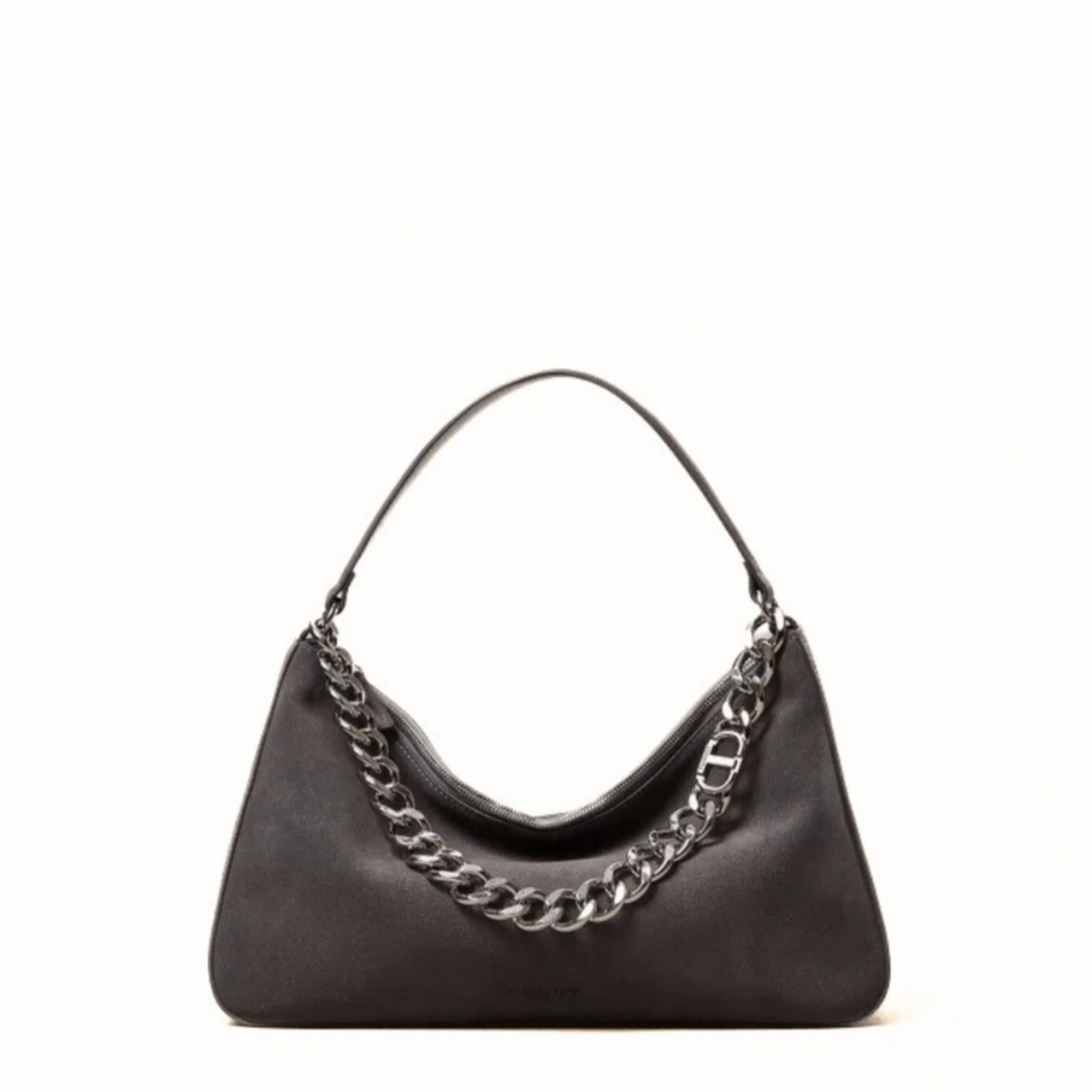 Borsa hobo 'Liliane' di TWINSET made in Italy, realizzata in pelle scamosciata con trattamento anti stingimento. Il corpo è realizzato a colonna con un rinforzo in microfibra, con logo impresso a caldo, e foderato con un twill in misto cotone. Ha due manici staccabili, da indossare simultaneamente o separati per diverse interpretazioni di styling: uno in pelle sagomato e imbottito, l'altro è una catena in lega leggera in galvanica oro con l'Oval T inserito tra le maglie.