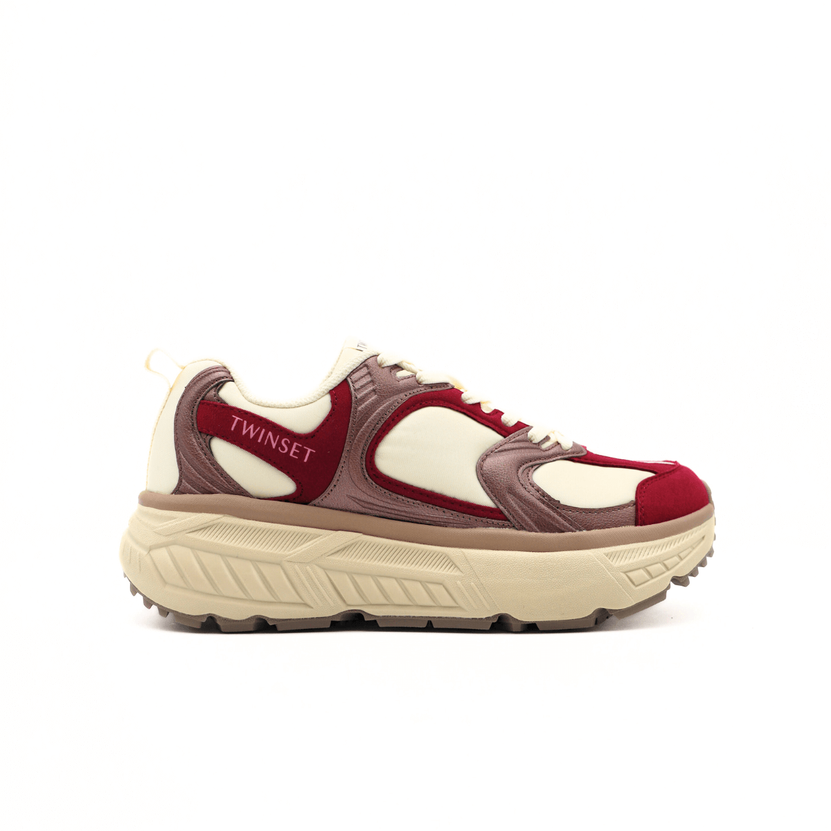 Sneaker running trail da donna di TWINSET In tessuto con inserti in suede e laminati, logo lettering laterale e fondo chunky in gomma. Sono realizzate in collaborazione con Fessura, le cui ricerche permettono prestazioni affidabili per amanti dell’outdoor.
