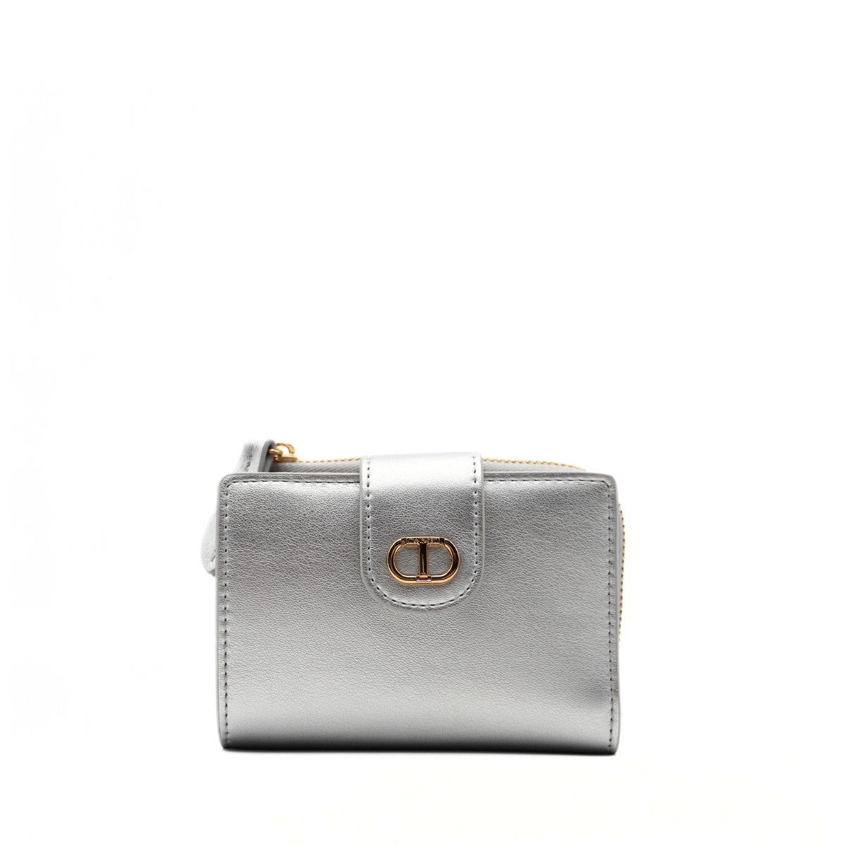 Portafoglio argento di TWINSET in similpelle liscia con logo Oval T in metallo. Ha doppio comparto, uno portamonete con chiusura a zip e l’altro centrale portacarte e portamonete con chiusura a linguetta e bottone automatico.