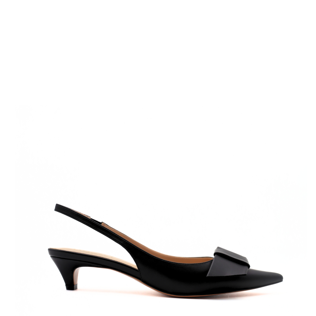 Sling back da donna di TWINSET, realizzato in similpelle nero con fiocco grafico e tacco obliquo fasciato in tinta. Interno e sottopiede in pelle. Cinturino non regolabile.
