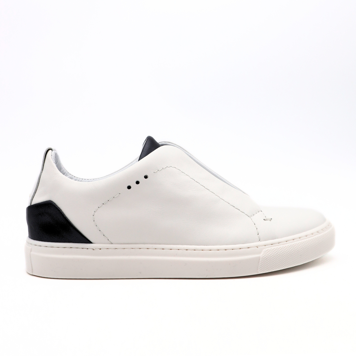 Slipon da donna di TYKO. Realizzata in pelle bianca con tallone nero. Internamente foderata, plantare interno sagomato e estraibile. Suola in gomma.