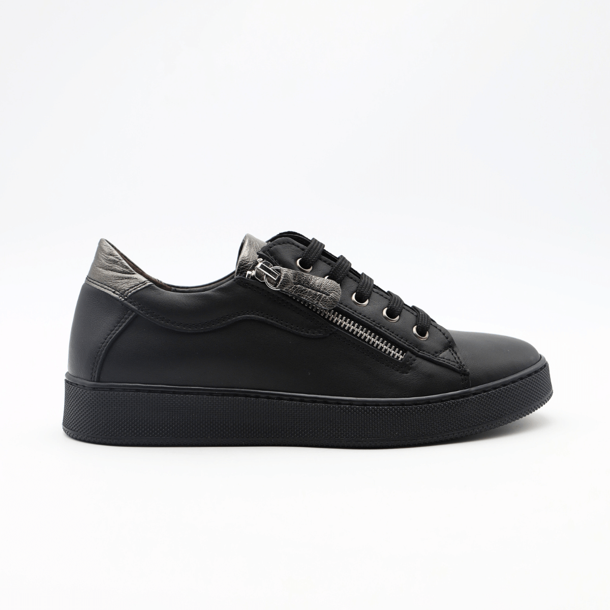 Sneaker donna di TYKO. Realizzata in pelle nera con inserto in pelle laminata color argento, con zip unilaterale, Interno foderato e sottopiede, estraibile, in pelle. Suola in gomma nera.