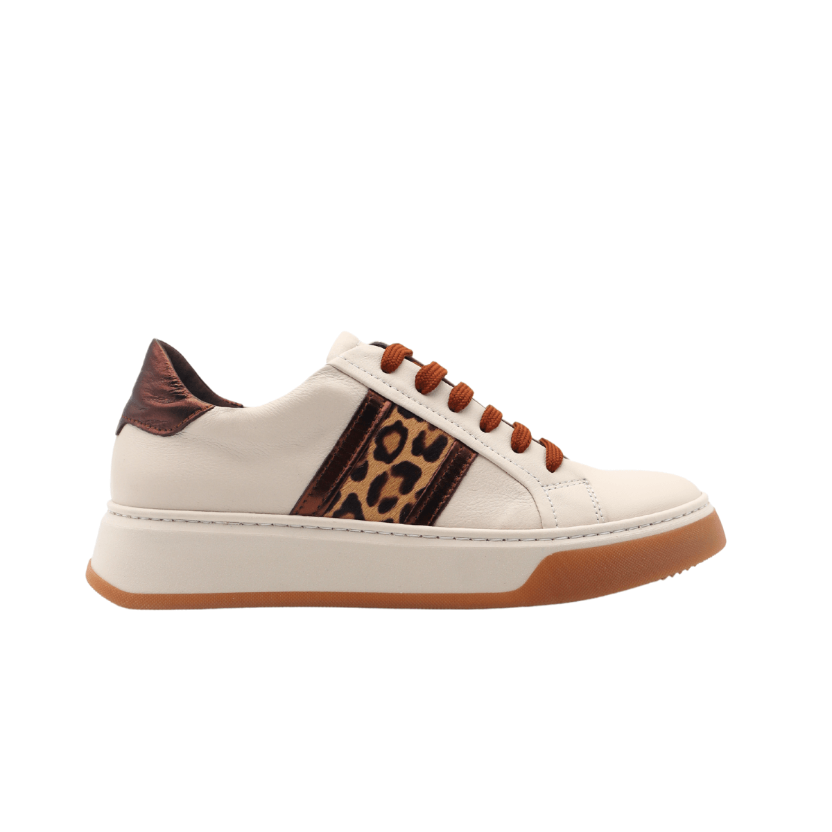 Sneaker donna di TYKO. Realizzata in pelle color latte con inserto in pelle laminata color bronzo sul tallone e fascia unilaterale maculato effetto cavallino, Interno foderato e sottopiede, estraibile, in pelle. Suola in gomma.