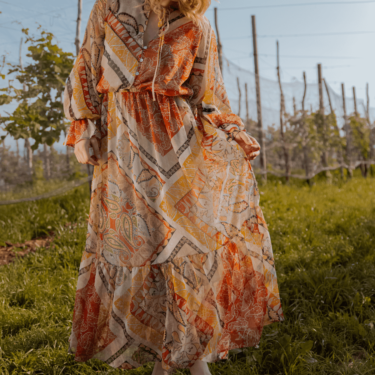 Abito lungo, da donna, di Vicolo. Realizzato in poliestere multicolore con sottogonna verde Tiffany, inserto elastico ad altezza della vita e chiusura con bottoni.