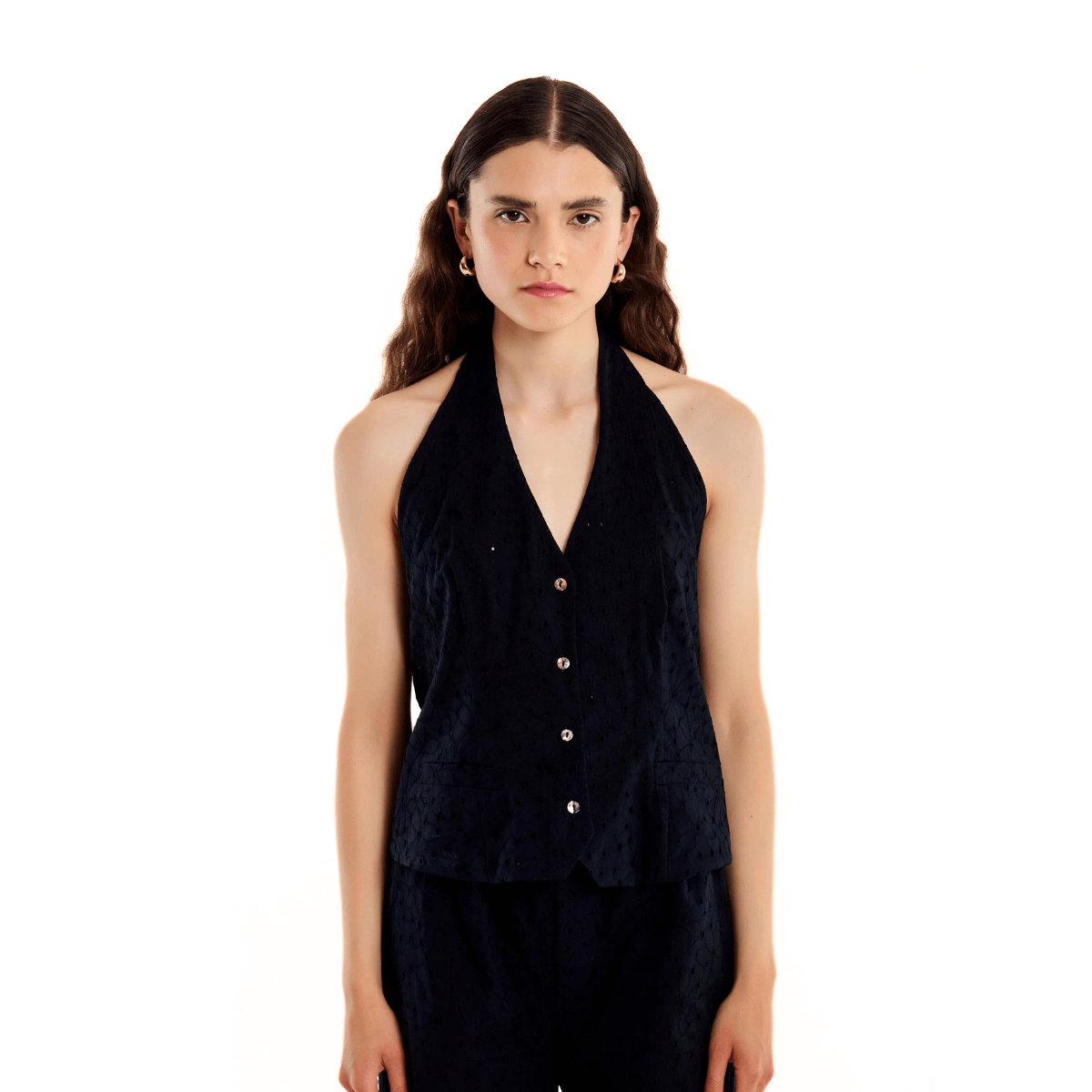 Gilet nero di VICOLO. Modello con scollo halter in sangallo. Chiusura frontale con bottoncini e tasche frontali a filetto. Elastico sul retro. Composizione: Cotone 100%