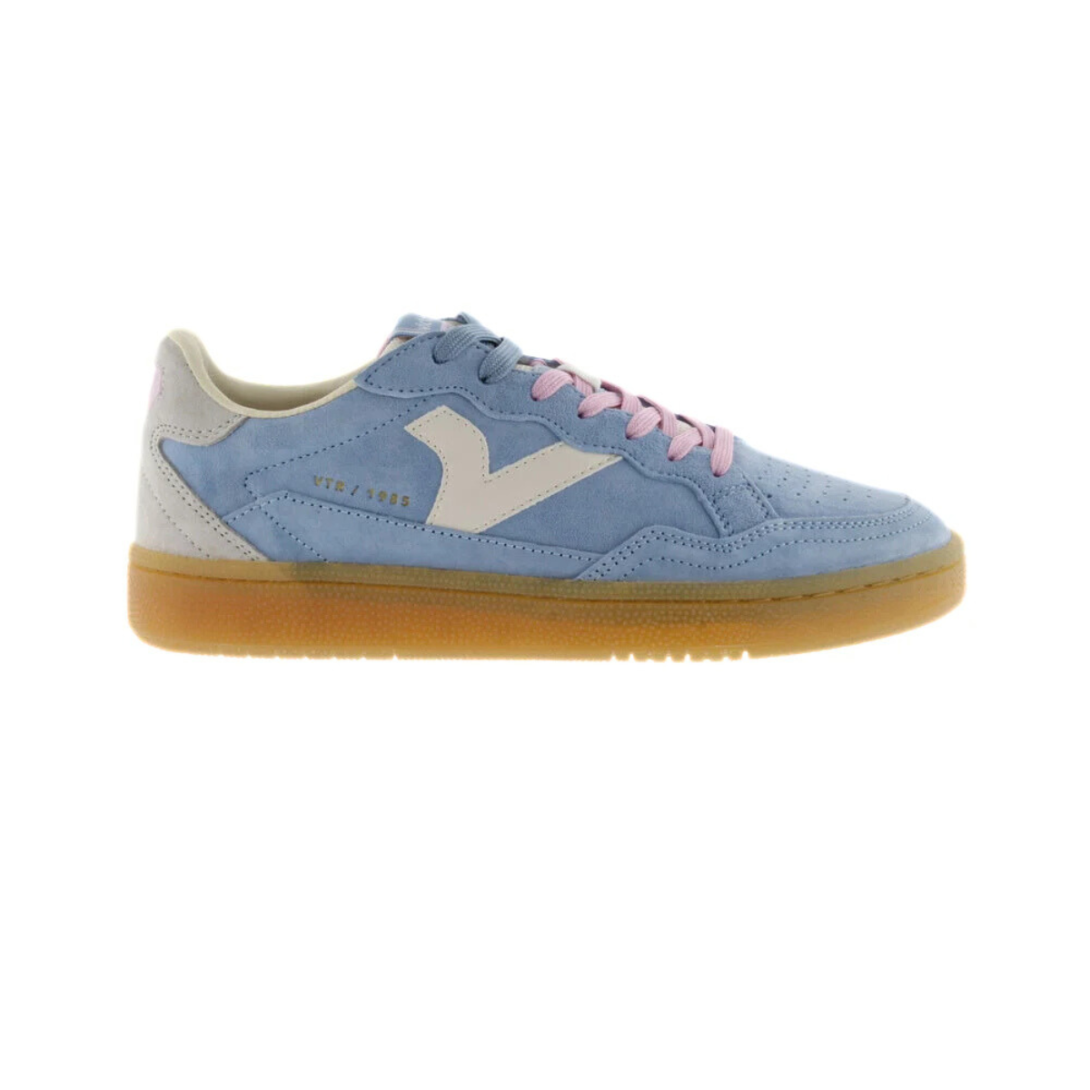 Sneakers da donna di VICTORIA. Tomaia realizzata in pelle nabuk azzurra con V bianca laterale. Chiusura con lacci (lacci azzurri in dotazione). Interno e sottopiede in tessuto e suola in gomma.