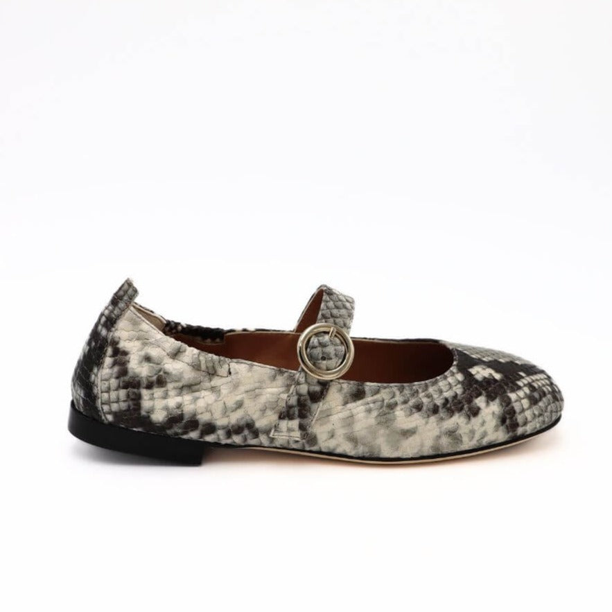 Ballerina bebè da donna di VIOLA RICCI, realizzata in pelle effetto pitone bianco e nero con cinturino con fibbia argento ed elastico sul tallone. Inteno e sottopiede morbido in pelle. Suola in cuoio con mezza pianta in gomma. Calzata piccola.